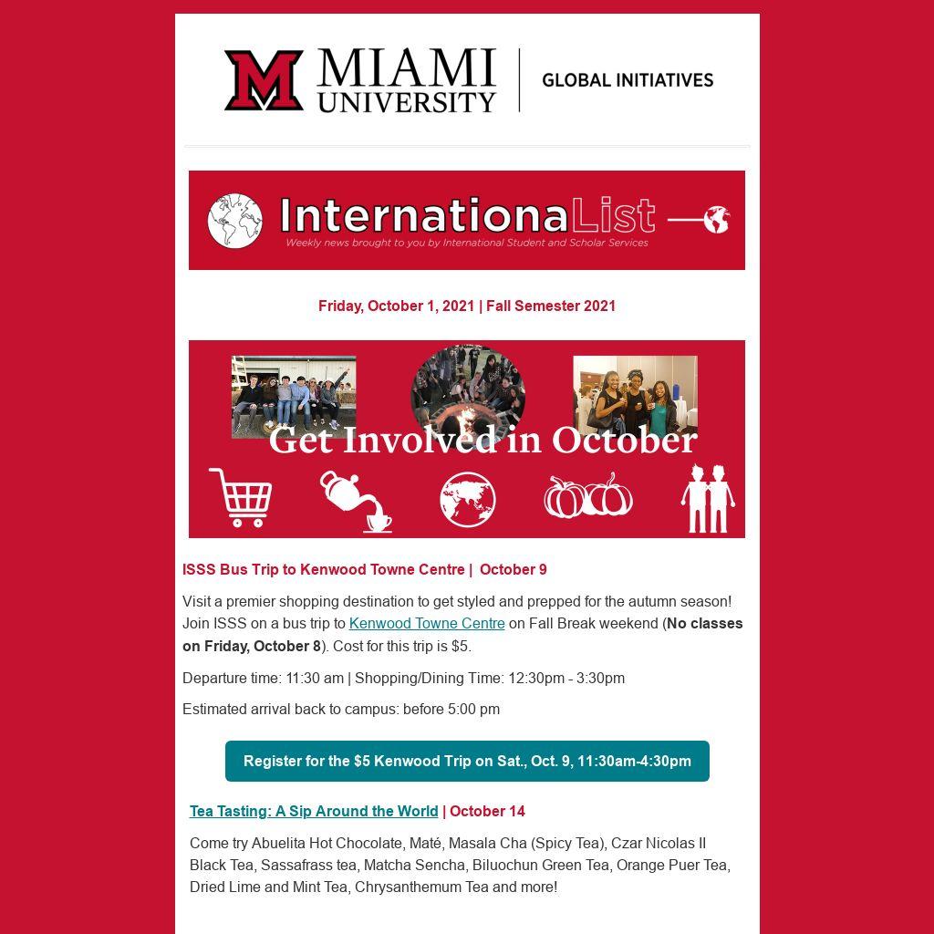 Visit a premier shopping destination to get styled and prepped for the autumn season! Join ISSS on a bus trip to Kenwood Towne Centre on Fall Break weekend (No classes on Friday, October 8). Cost for this trip is $5.