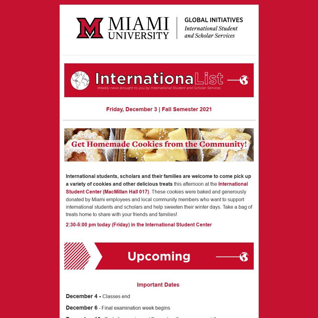 Graduating international students and their loved ones are invited to the International Student Center to enjoy global refreshments, meet with ISSS staff, take photos, receive a graduation gift, and leave their mark at Miami!