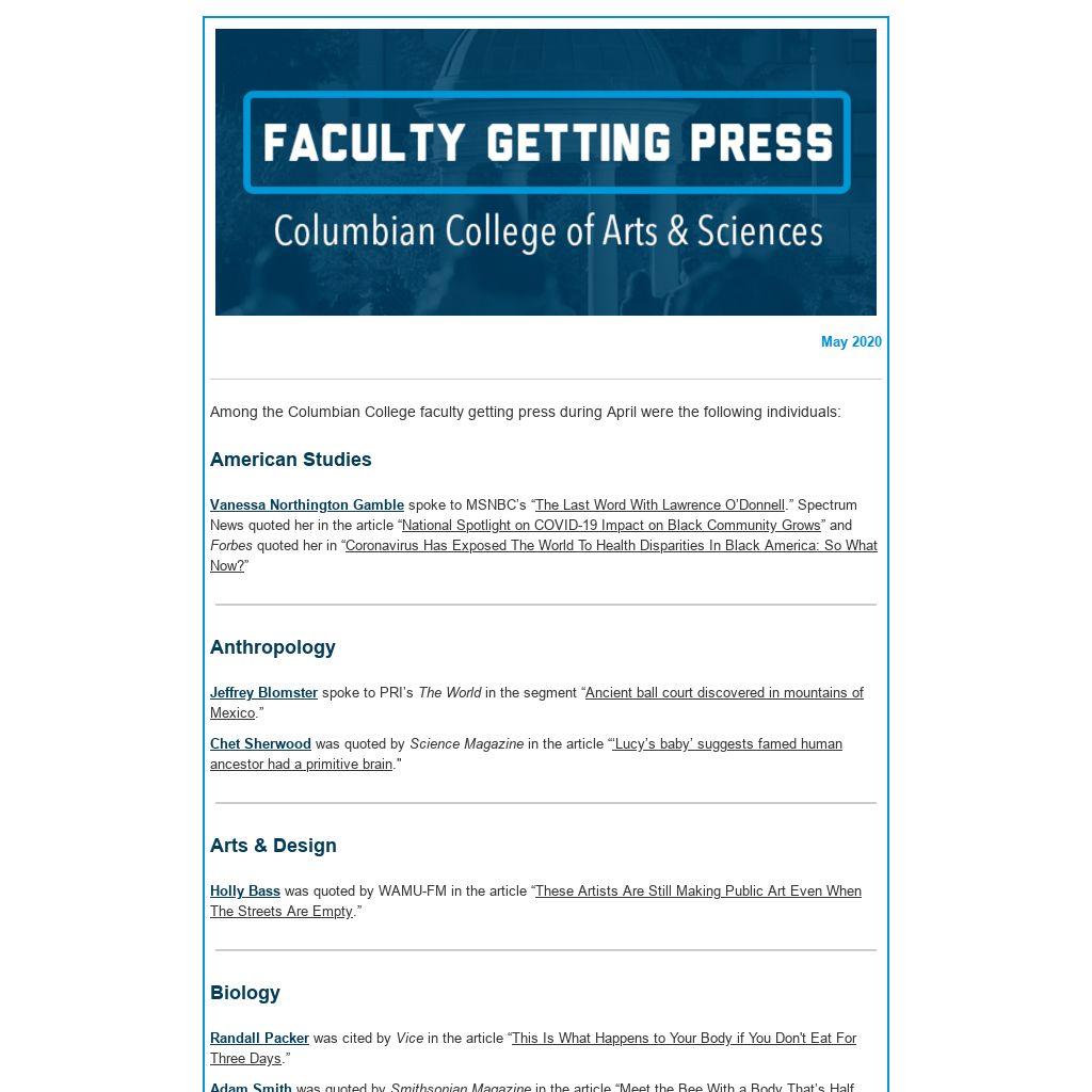 | | Among the Columbian College faculty getting press during April were the following individuals: