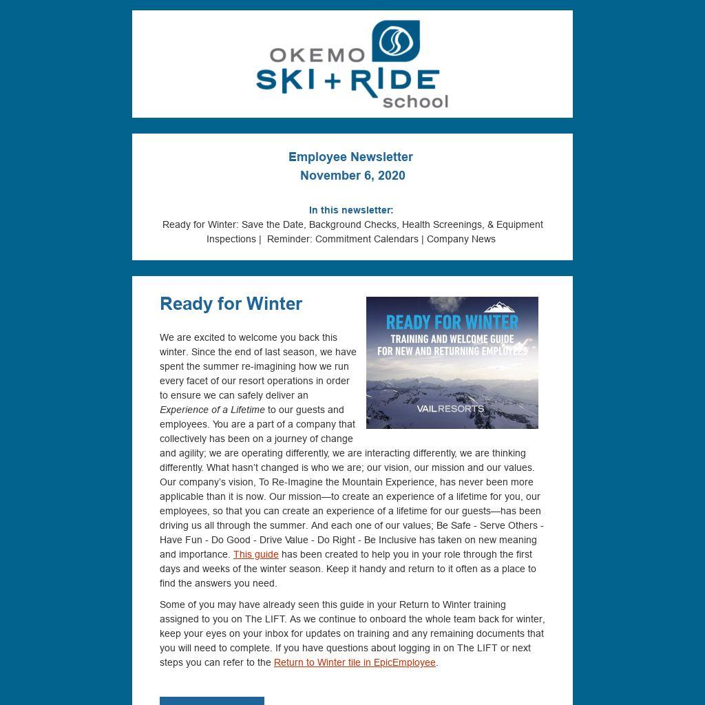 In this newsletter: Ready for Winter: Save the Date, Background Checks, Health Screenings, & Equipment Inspections | Reminder: Commitment Calendars | Company News