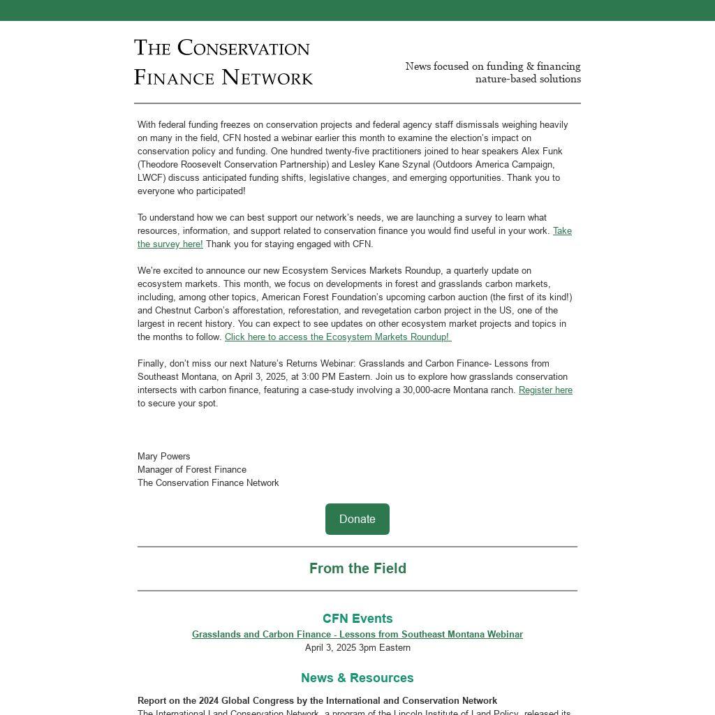 To understand how we can best support our network’s needs, we are launching a survey to learn what resources, information, and support related to conservation finance you would find useful in your work. Take the survey here! Thank you for staying engaged with CFN.