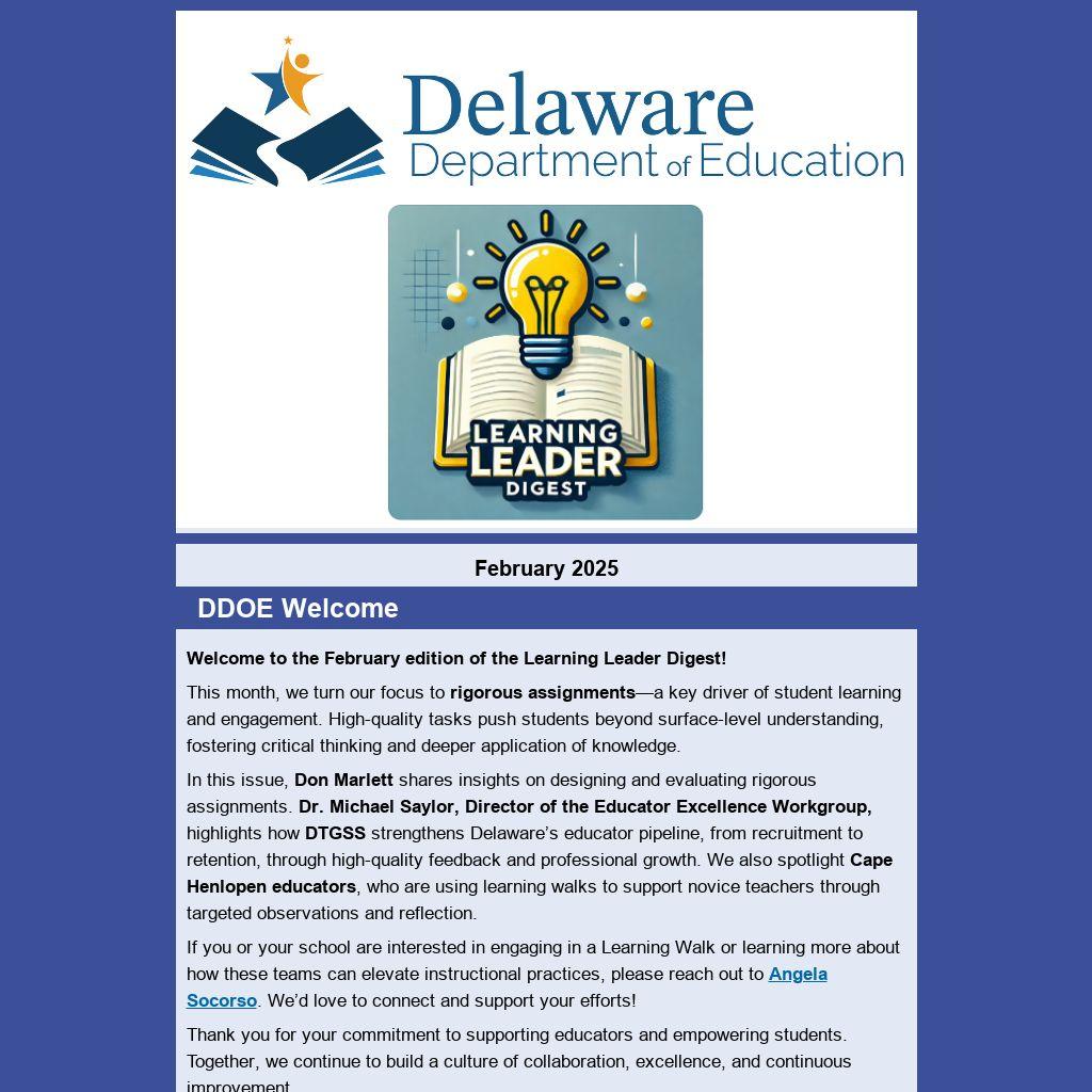 In this issue, Don Marlett shares insights on designing and evaluating rigorous assignments. Dr. Michael Saylor, Director of the Educator Excellence Workgroup, highlights how DTGSS strengthens Delaware’s educator pipeline, from recruitment to retention, through high-quality feedback and professional growth. We also spotlight Cape Henlopen educators, who are using learning walks to support novice teachers through targeted observations and reflection.