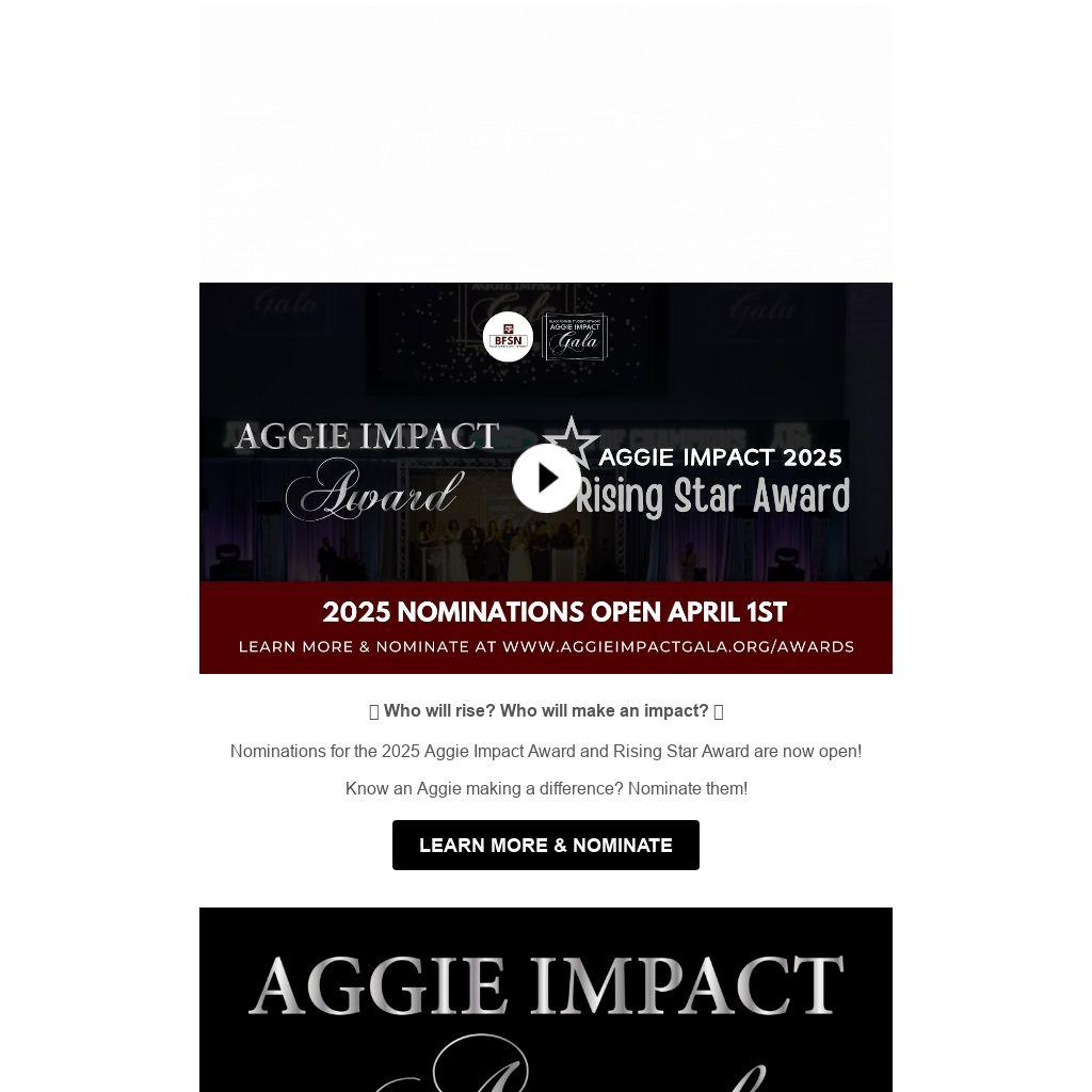 Nominations for the 2025 Aggie Impact Award and Rising Star Award are now open!