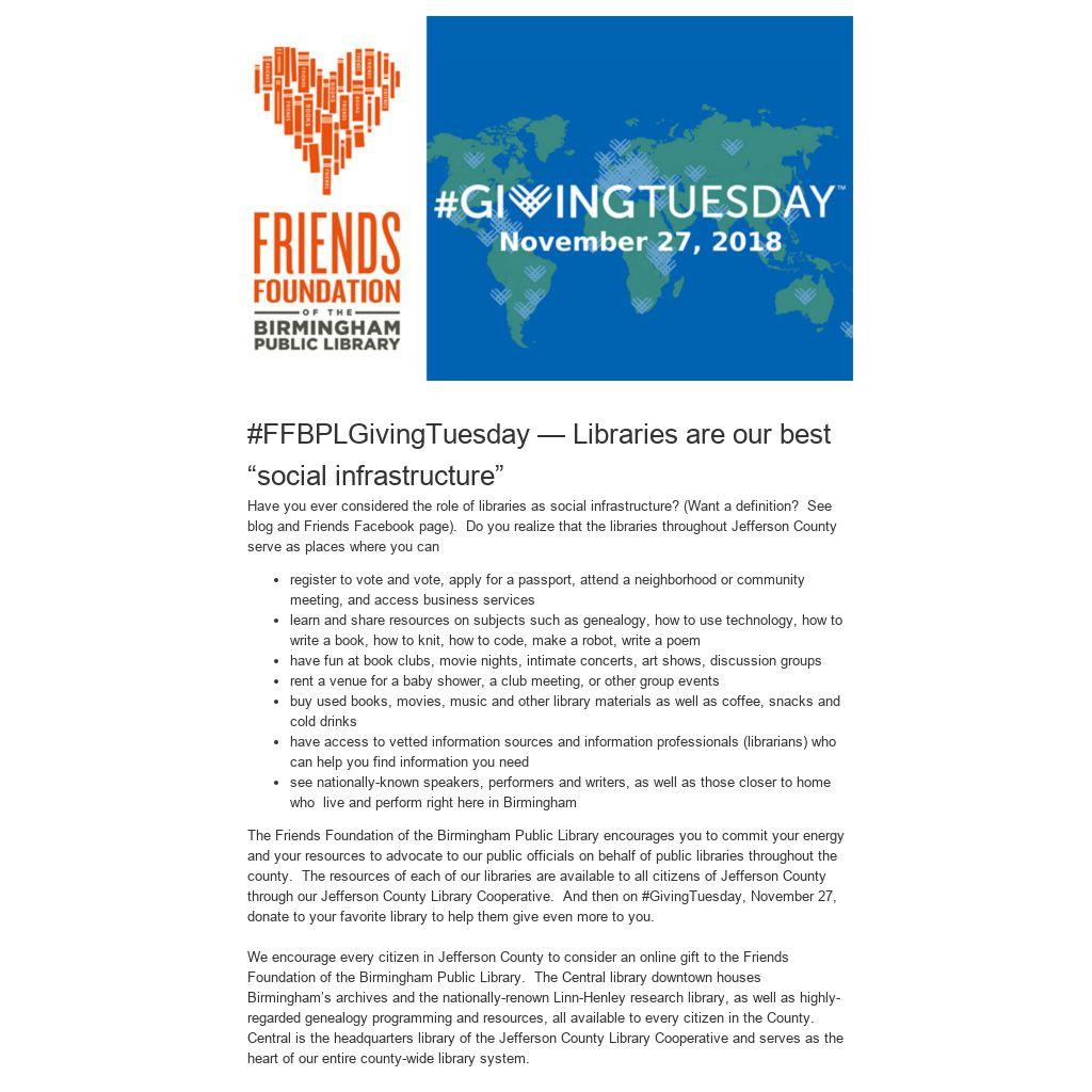 The Friends Foundation of the Birmingham Public Library encourages you to commit your energy and your resources to advocate to our public officials on behalf of public libraries throughout the county. The resources of each of our libraries are available to all citizens of Jefferson County through our Jefferson County Library Cooperative. And then on #GivingTuesday, November 27, donate to your favorite library to help them give even more to you.