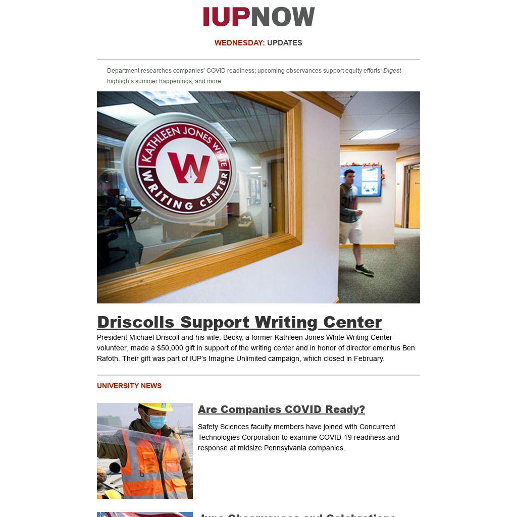 Distributed to IUP employees and students three days a week on its summer schedule, IUP Now is the official newsletter of Indiana University of Pennsylvania. It features news from across the IUP website, compiled by the Division of Marketing and Communications. Find out how to get your news and events in IUP Now.