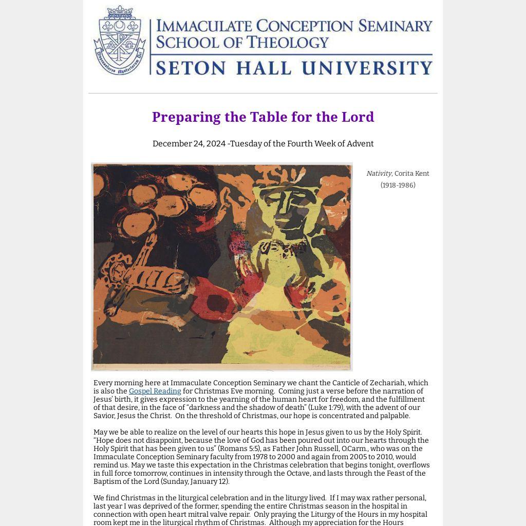 May we be able to realize on the level of our hearts this hope in Jesus given to us by the Holy Spirit. “Hope does not disappoint, because the love of God has been poured out into our hearts through the Holy Spirit that has been given to us” (Romans 5:5), as Father John Russell, O.Carm., who was on the Immaculate Conception Seminary faculty from 1978 to 2000 and again from 2005 to 2010, would remind us. May we taste this expectation in the Christmas celebration that begins tonight, overflows in full force tomorrow, continues in intensity through the Octave, and lasts through the Feast of the Baptism of the Lord (Sunday, January 12).