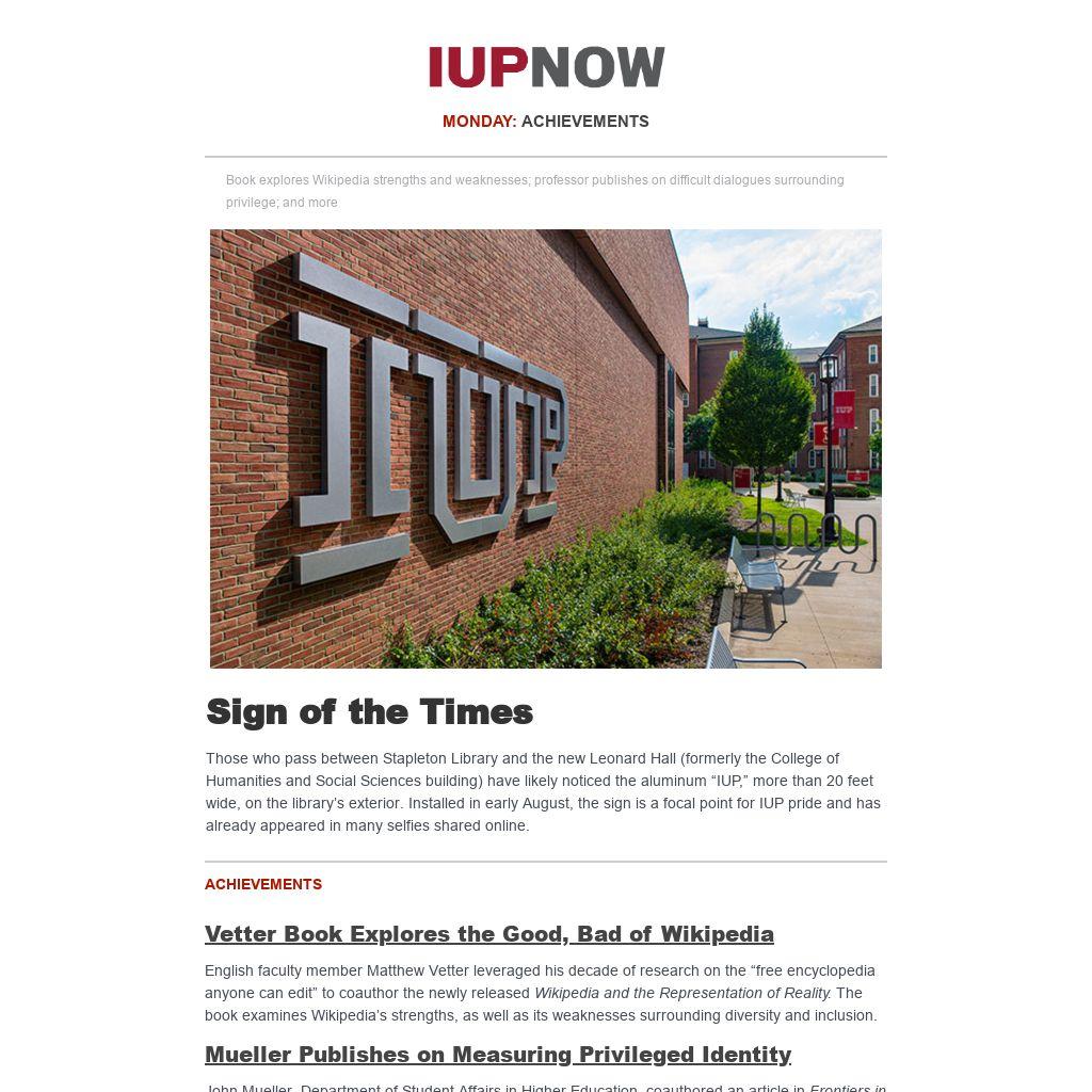 Those who pass between Stapleton Library and the new Leonard Hall (formerly the College of Humanities and Social Sciences building) have likely noticed the aluminum “IUP,” more than 20 feet wide, on the library’s exterior. Installed in early August, the sign is a focal point for IUP pride and has already appeared in many selfies shared online.