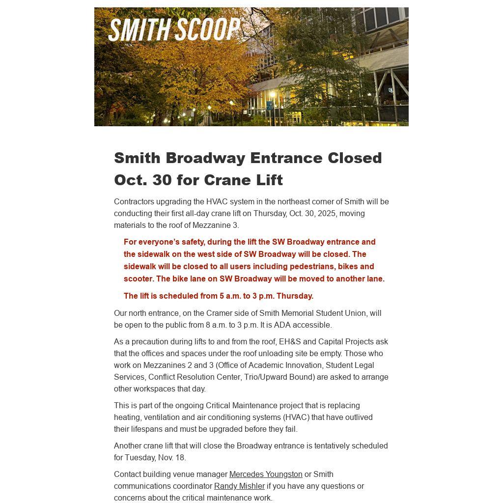 Contractors upgrading the HVAC system in the northeast corner of Smith will be conducting their first all-day crane lift on Thursday, Oct. 30, 2025, moving materials to the roof of Mezzanine 3.