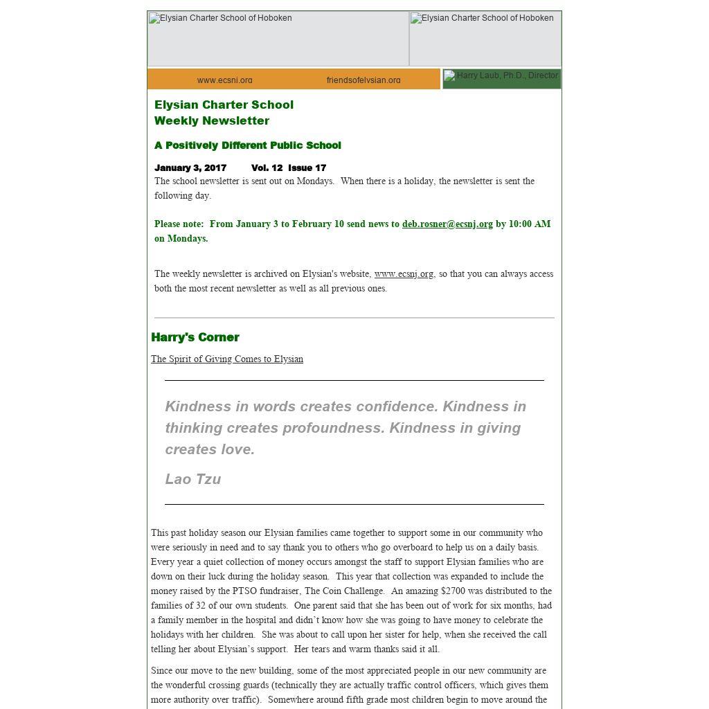 The weekly newsletter is archived on Elysian's website, www.ecsnj.org, so that you can always access both the most recent newsletter as well as all previous ones.