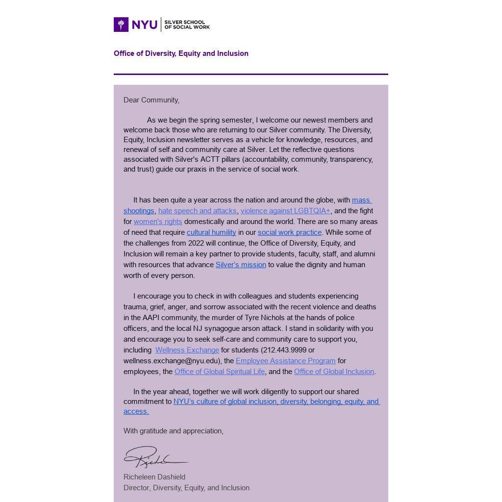 As we begin the spring semester, I welcome our newest members and welcome back those who are returning to our Silver community. The Diversity, Equity, Inclusion newsletter serves as a vehicle for knowledge, resources, and renewal of self and community care at Silver. Let the reflective questions associated with Silver's ACTT pillars (accountability, community, transparency, and trust) guide our praxis in the service of social work.