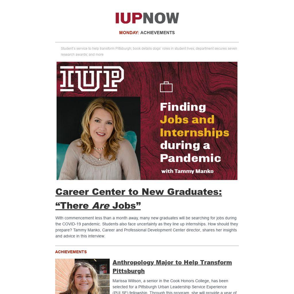 Distributed to IUP employees and students four days a week, IUP Now is the official newsletter of Indiana University of Pennsylvania. It features news from across the IUP website, compiled by the Division of Marketing and Communications. Find out how to get your news and events in IUP Now.