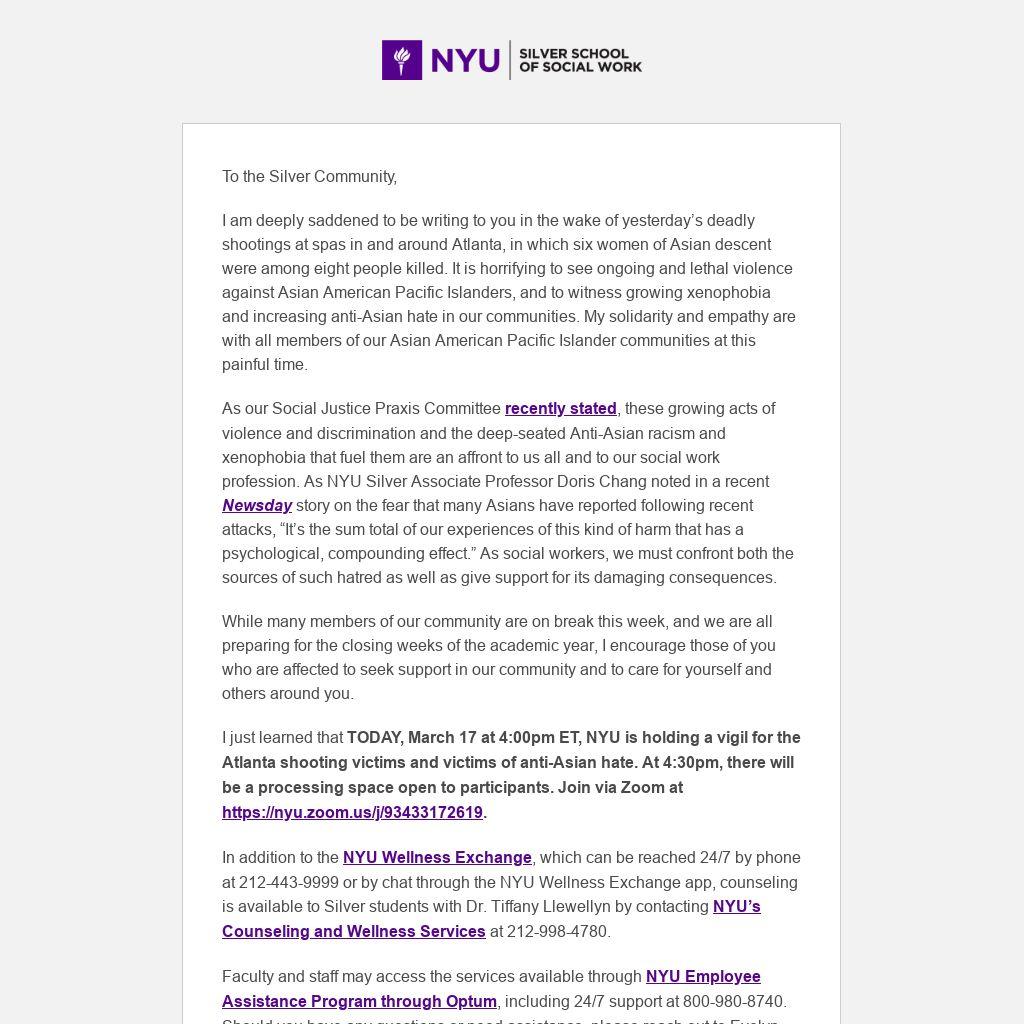 TODAY, March 17 at 4:00pm ET, NYU is holding a vigil for the Atlanta shooting victims and victims of anti-Asian hate. At 4:30pm, there will be a processing space open to participants. Join via Zoom at https://nyu.zoom.us/j/93433172619.