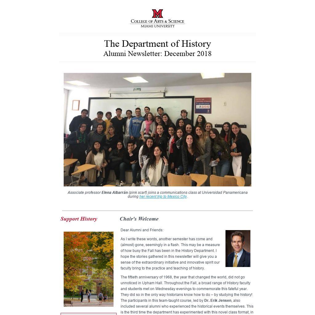 Dear Alumni and Friends: As I write these words, another semester has come and (almost) gone, seemingly in a flash. This may be a measure of how busy the Fall has been in the History Department. I hope the stories gathered in this newsletter will give you a sense of the extraordinary initiative and innovative spirit our faculty bring to the practice and teaching of history. The fiftieth anniversary of 1968, the year that changed the world, did not go unnoticed in Upham Hall. Throughout the Fall, a broad range of History faculty and students met on Wednesday evenings to commemorate this fateful year. They did so in the only way historians know how to do – by studying the history! The participants in this team-taught course, led by Dr. Erik Jensen, also included several alumni who experienced the historical events themselves. This is the third time the department has experimented with this novel class format, in which faculty volunteer their time to explore topical themes with any interested students. Some of the results of their work are presented below. This newsletter also describes our colleagues’ engagement with another emerging interest – the history of food. Drs. Marguerite Shaffer, co-founder of the Food Institute at Miami University, and Cameron Shriver, researcher at the Myaamia Center, are both contributors to a fascinating new digital humanities project, entitled Educating from the Ground Up. The project documents the history of agriculture, beekeeping, and food production in Miami’s own backyard, connecting these local enterprises to larger trends in the world. These are just some examples of the classroom projects, public events, and student and faculty accomplishments featured below. In bittersweet news, our long-time administrative assistant Jeri Schaner will be retiring at the end of December following a long career at Miami University. Jeri has made the department office run like precision clockwork from 1989 onwards – no mean feat considering the constant demands made on her by faculty and students alike. She has done so in a characteristically understated way, with endless patience, competence, and wit. Thank you, Jeri, for making our work possible and humoring us for all these years. You will be deeply missed. Best wishes in your well-deserved retirement.