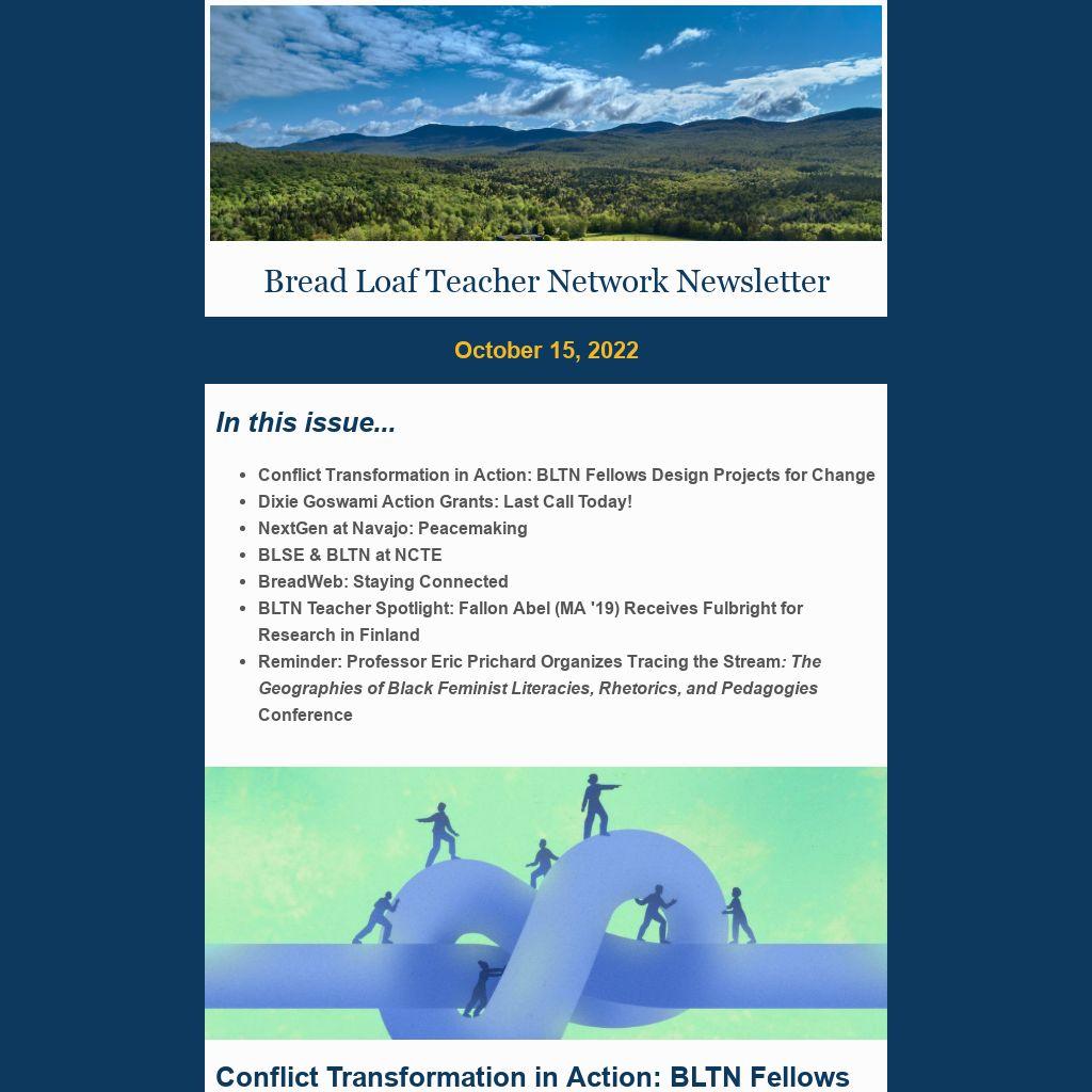 During and after the September 29 BLTN Zoom meeting, BLTNers weighed in on how they would like to keep in touch, in addition to our every-other-month synchronous meetings. Ideas included a mix of responding to writing prompts together, discussing "problems of practice," reading published pieces together, and virtual visits to classrooms (along the lines of last year's Classroom Spotlights). Jacob Belvery, a 2022 Change Fellow, will prompt us to write and respond to one another for the remainder of October. Stay tuned for his prompt on BreadWeb, in the group BLTN General. In coming months, we'll have discussions hosted by Erin Tabor, Leslie Schallock, Kayla Hostetler, and Clara Natanobah. All are welcome. Contact Tom McKenna if you have questions about participating, or if you have an interest in facilitating an asynchronous discussion.