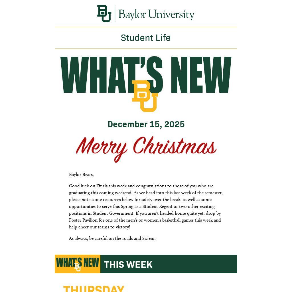 If you are a department or Baylor student organization and have items you would like to see appear in What's New BU, submit them for consideration by Friday at 8 a.m. by clicking here or emailing them to whatsnew@baylor.edu. View past issues of What’s New BU here.