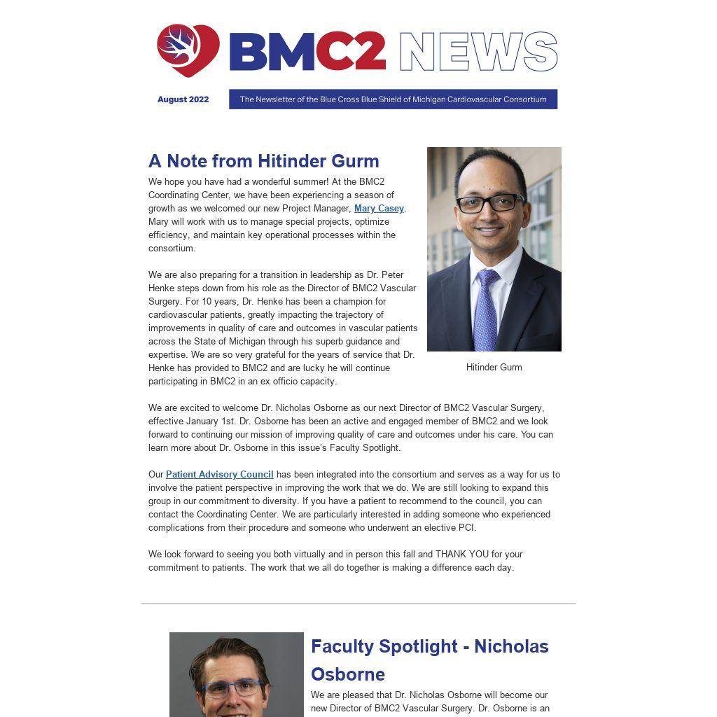 We are also preparing for a transition in leadership as Dr. Peter Henke steps down from his role as the Director of BMC2 Vascular Surgery. For 10 years, Dr. Henke has been a champion for cardiovascular patients, greatly impacting the trajectory of improvements in quality of care and outcomes in vascular patients across the State of Michigan through his superb guidance and expertise. We are so very grateful for the years of service that Dr. Henke has provided to BMC2 and are lucky he will continue participating in BMC2 in an ex officio capacity.