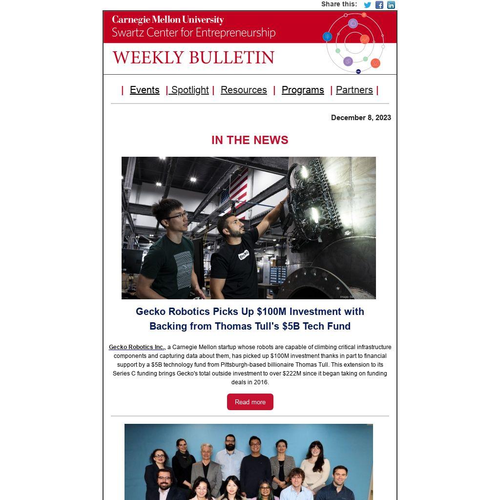 Have startup news or opportunities to share? Have questions about the Swartz Center Weekly Bulletin? Send news, opportunities or questions to Sonya Ford, Program Manager.