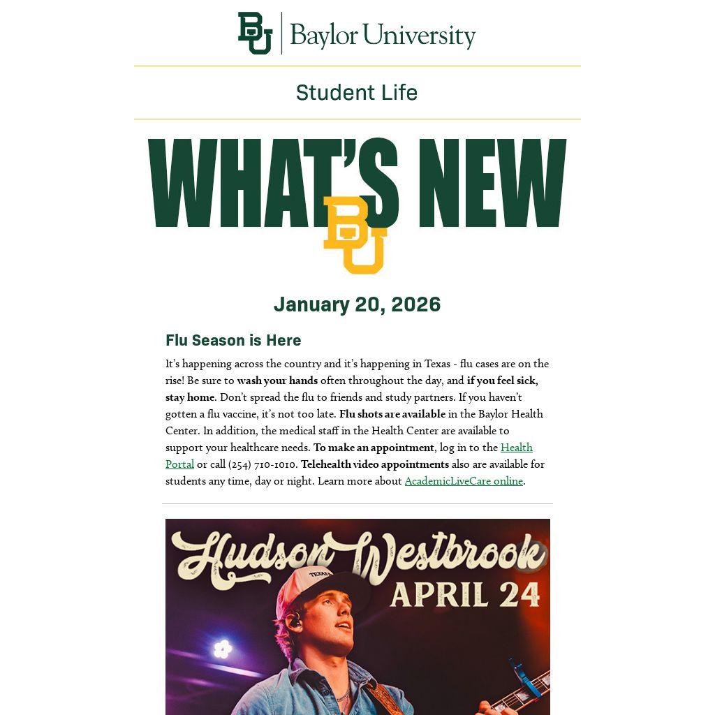 If you are a department or Baylor student organization and have items you would like to see appear in What's New BU, submit them for consideration by Friday at 8 a.m. by clicking here or emailing them to whatsnew@baylor.edu. View past issues of What’s New BU here.