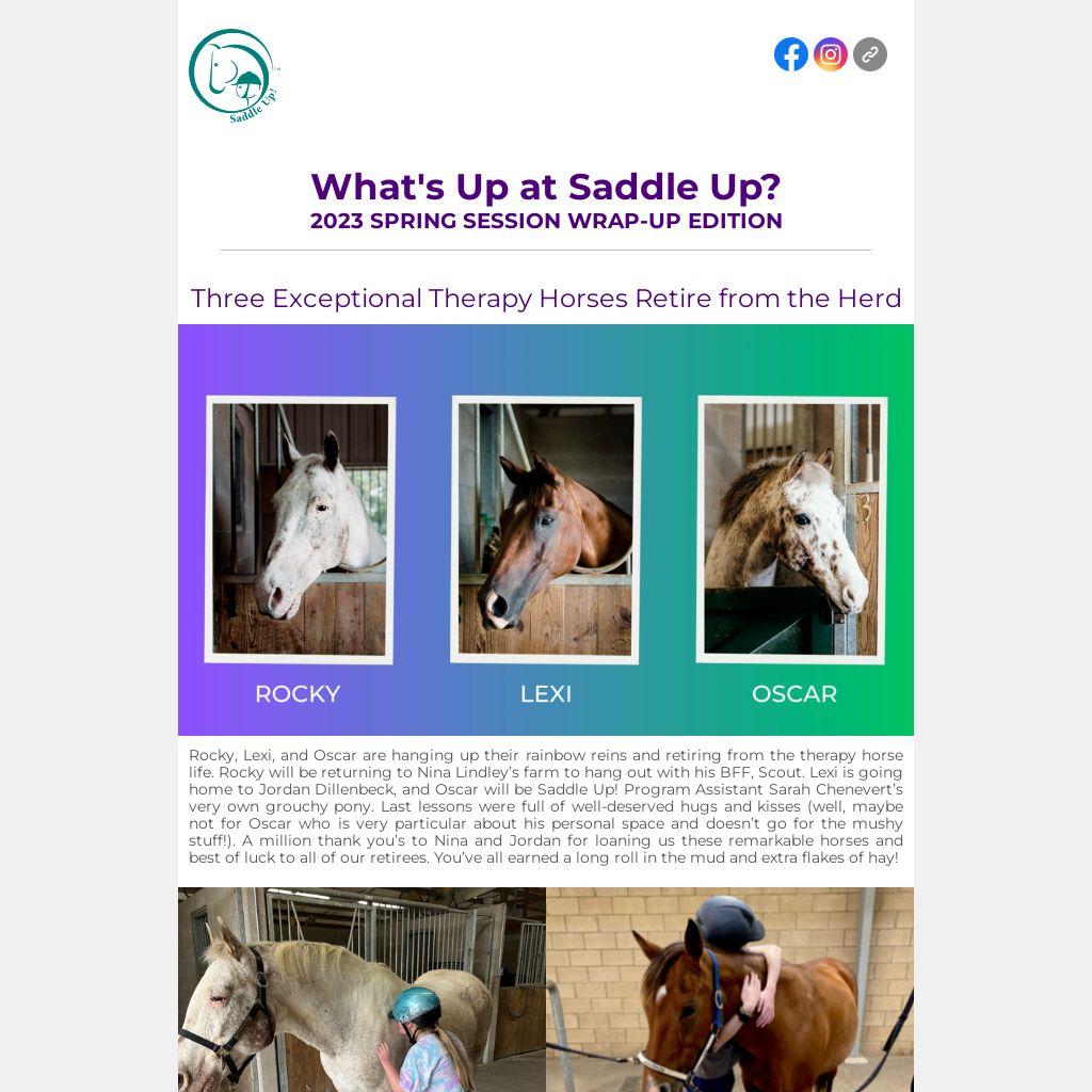 Rocky, Lexi, and Oscar are hanging up their rainbow reins and retiring from the therapy horse life. Rocky will be returning to Nina Lindley’s farm to hang out with his BFF, Scout. Lexi is going home to Jordan Dillenbeck, and Oscar will be Saddle Up! Program Assistant Sarah Chenevert’s very own grouchy pony. Last lessons were full of well-deserved hugs and kisses (well, maybe not for Oscar who is very particular about his personal space and doesn’t go for the mushy stuff!). A million thank you’s to Nina and Jordan for loaning us these remarkable horses and best of luck to all of our retirees. You’ve all earned a long roll in the mud and extra flakes of hay!
