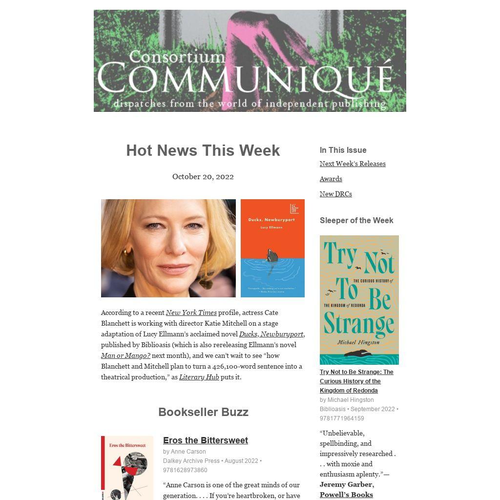 According to a recent New York Times profile, actress Cate Blanchett is working with director Katie Mitchell on a stage adaptation of Lucy Ellmann’s acclaimed novel Ducks, Newburyport, published by Biblioasis (which is also rereleasing Ellmann’s novel Man or Mango? next month), and we can’t wait to see “how Blanchett and Mitchell plan to turn a 426,100-word sentence into a theatrical production,” as Literary Hub puts it.