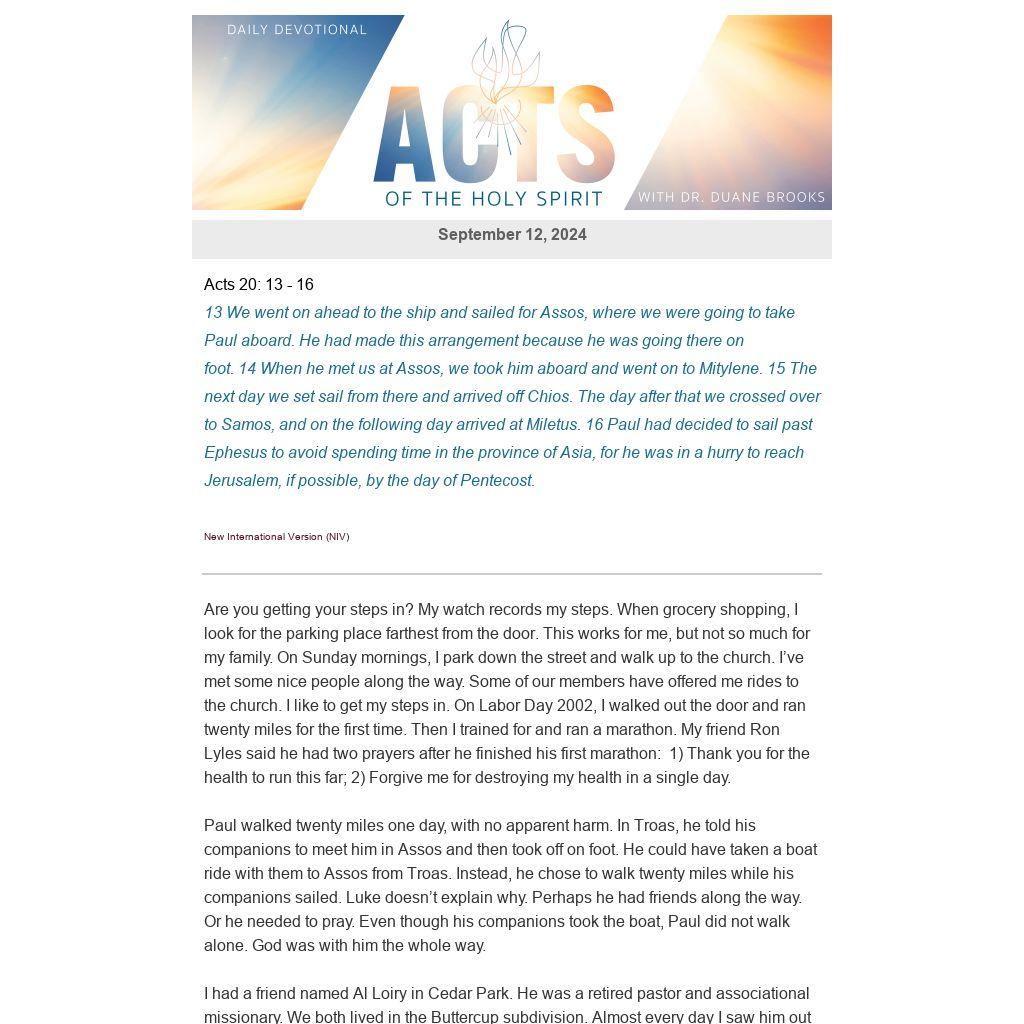 Luke records stops in the Greek Isles of Chios and Samos before they reached Miletus. Paul stopped on the shore to avoid being held up in Asia. The Apostle was a man on a mission. He wanted to reach Jerusalem by the day of Pentecost, and he knew he was cutting it close. Imagine being in Jerusalem on Pentecost, celebrating the birth of the church and the coming of the Holy Spirit in the very place where it happened. In his letter to the Galatians, Paul wrote about walking in the Spirit. After listing the fruit of the Spirit and calling the Galatians to crucifixion of the flesh, he said, “Since we live by the Spirit, let us keep in step with the Spirit” (Galatians 5:25).