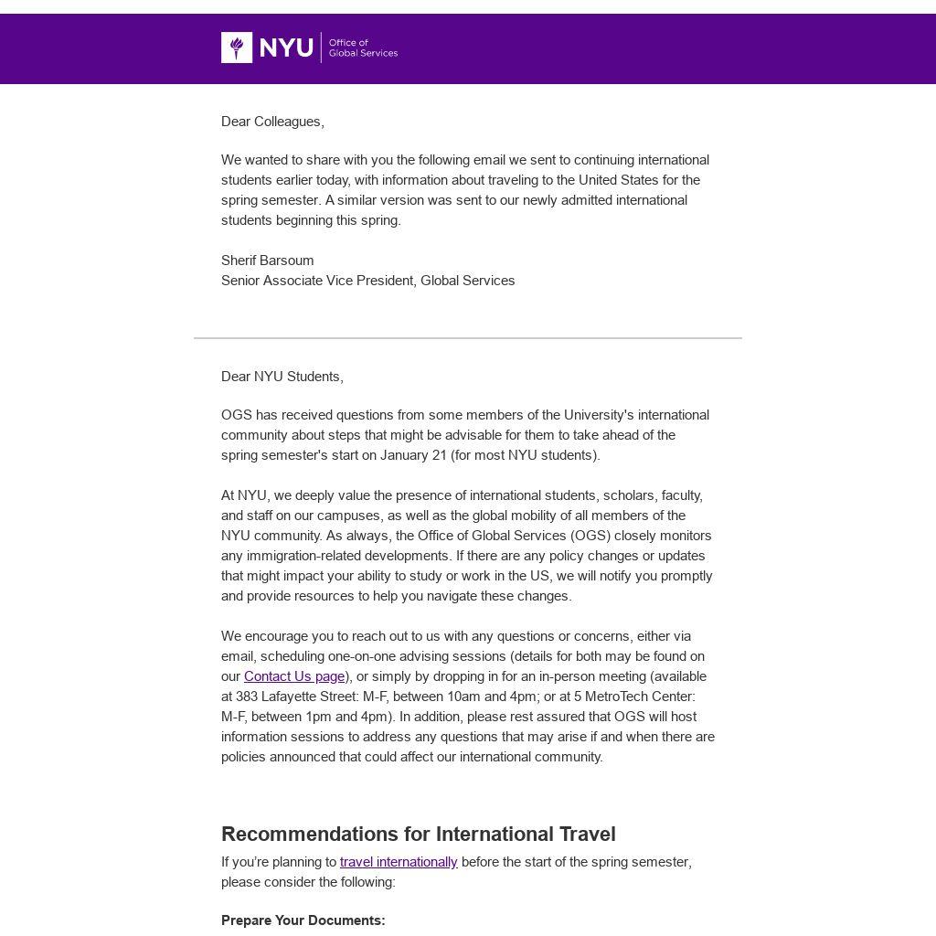 OGS has received questions from some members of the University's international community about steps that might be advisable for them to take ahead of the spring semester's start on January 21 (for most NYU students).