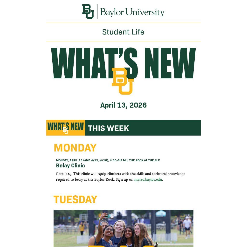 If you are a department or Baylor student organization and have items you would like to see appear in What's New BU, submit them for consideration by Friday at 8 a.m. by clicking here or emailing them to whatsnew@baylor.edu. View past issues of What’s New BU here.