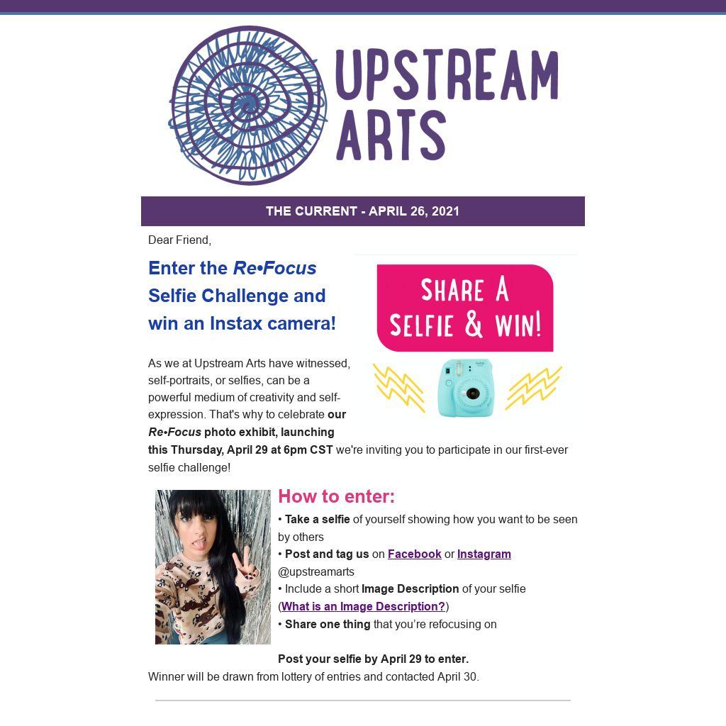 As we at Upstream Arts have witnessed, self-portraits, or selfies, can be a powerful medium of creativity and self-expression. That's why to celebrate our Re•Focus photo exhibit, launching this Thursday, April 29 at 6pm CST we're inviting you to participate in our first-ever selfie challenge!