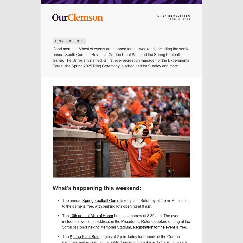 Good morning! A host of events are planned for this weekend, including the semi-annual South Carolina Botanical Garden Plant Sale and the Spring Football Game. The University named its first-ever recreation manager for the Experimental Forest, the Spring 2025 Ring Ceremony is scheduled for Sunday and more.