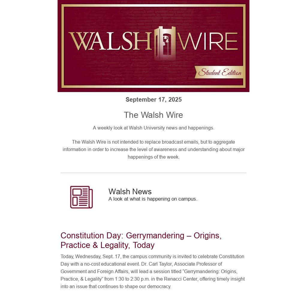 The Walsh Wire is not intended to replace broadcast emails, but to aggregate information in order to increase the level of awareness and understanding about major happenings of the week.