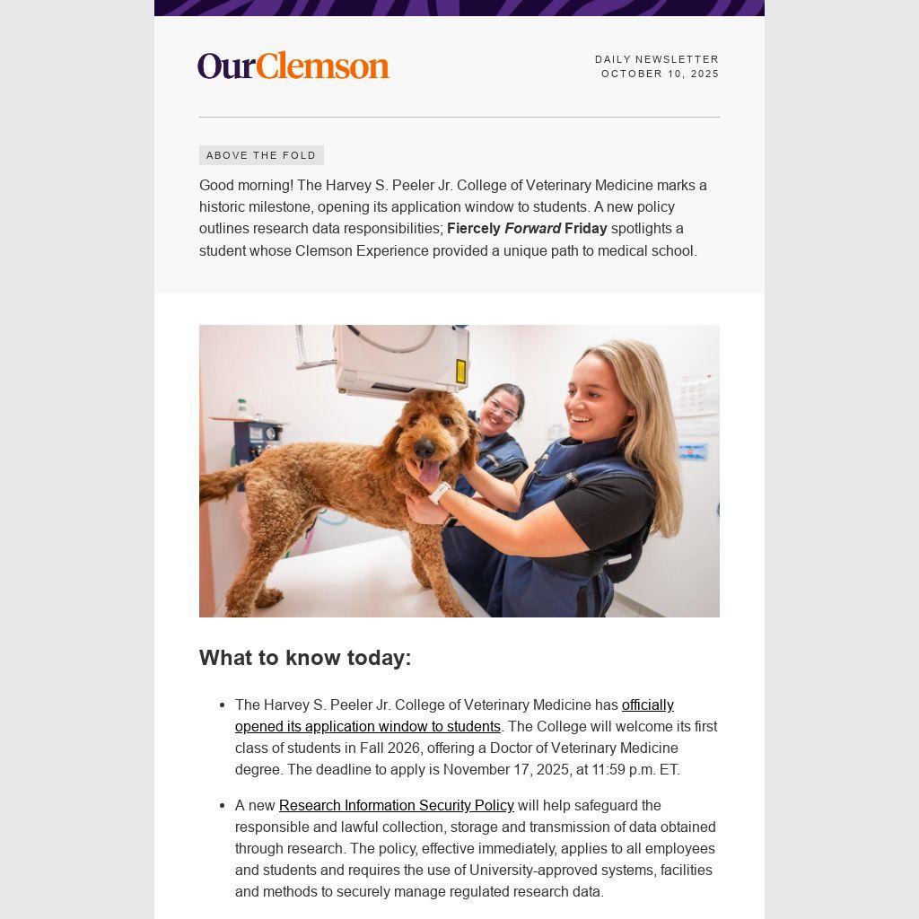 Good morning! The Harvey S. Peeler Jr. College of Veterinary Medicine marks a historic milestone, opening its application window to students. A new policy outlines research data responsibilities; Fiercely Forward Friday spotlights a student whose Clemson Experience provided a unique path to medical school.