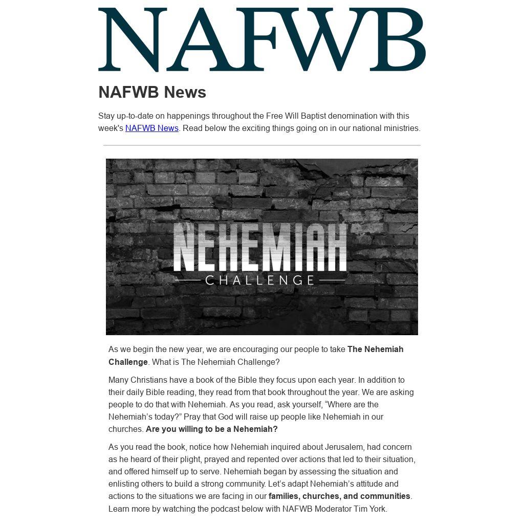 As you read the book, notice how Nehemiah inquired about Jerusalem, had concern as he heard of their plight, prayed and repented over actions that led to their situation, and offered himself up to serve. Nehemiah began by assessing the situation and enlisting others to build a strong community. Let’s adapt Nehemiah’s attitude and actions to the situations we are facing in our families, churches, and communities. Learn more by watching the podcast below with NAFWB Moderator Tim York.