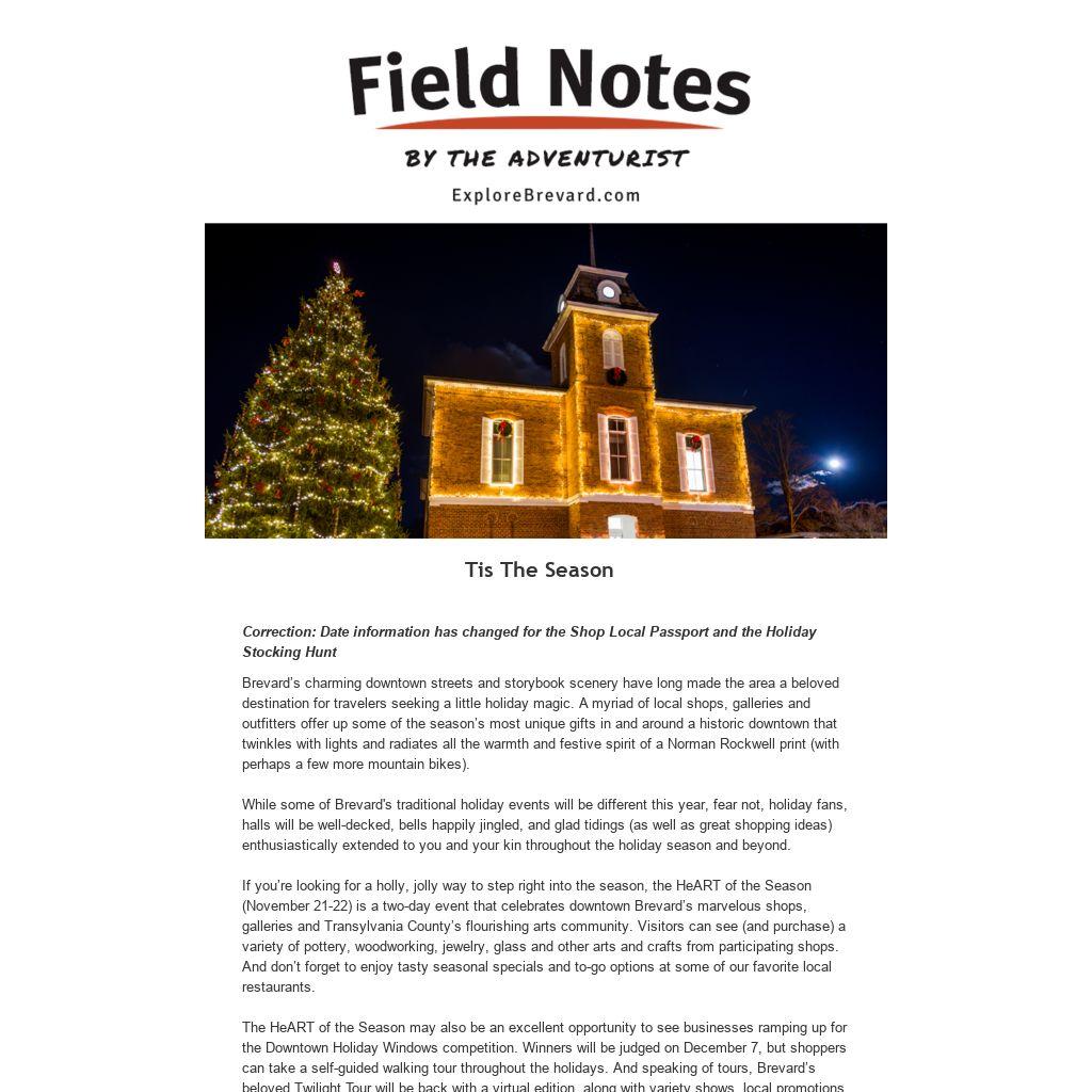 While some of Brevard's traditional holiday events will be different this year, fear not, holiday fans, halls will be well-decked, bells happily jingled, and glad tidings (as well as great shopping ideas) enthusiastically extended to you and your kin throughout the holiday season and beyond.