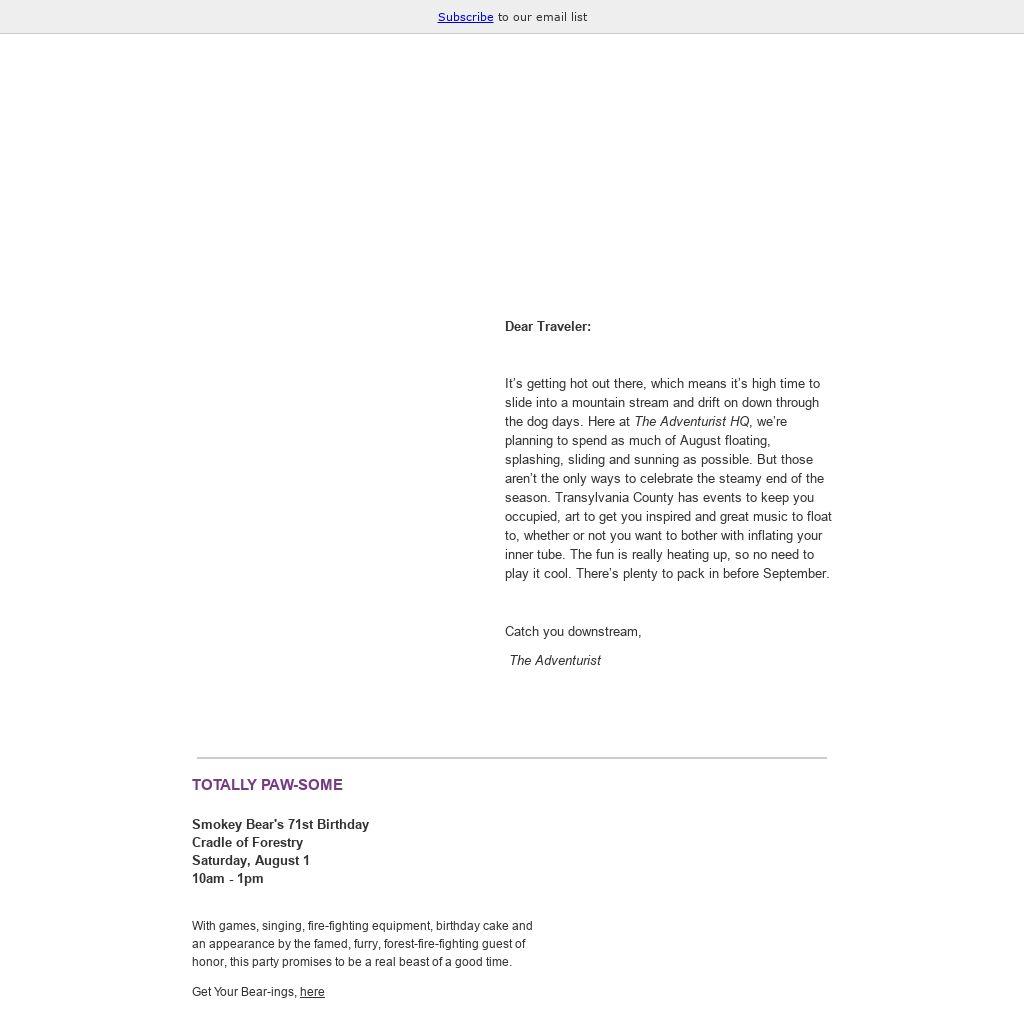 It’s getting hot out there, which means it’s high time to slide into a mountain stream and drift on down through the dog days. Here at The Adventurist HQ, we’re planning to spend as much of August floating, splashing, sliding and sunning as possible. But those aren’t the only ways to celebrate the steamy end of the season. Transylvania County has events to keep you occupied, art to get you inspired and great music to float to, whether or not you want to bother with inflating your inner tube. The fun is really heating up, so no need to play it cool. There’s plenty to pack in before September.