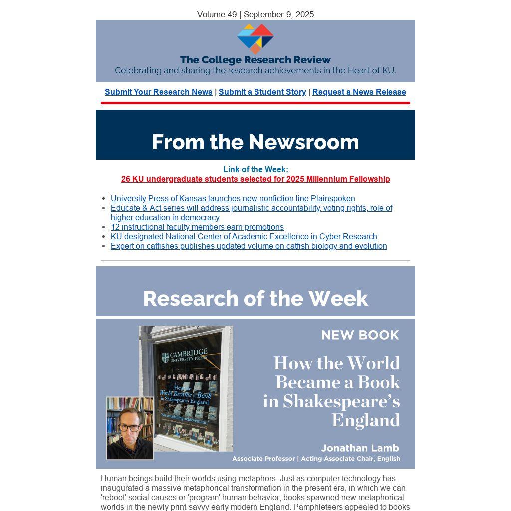 The College Dean's Communications Team is looking for faculty doing interesting research to be featured in videos, social media, websites, blogs, and more. Help us elevate the amazing research in the College by sharing with us and the broader KU and Kansas communities. Interested? Fill out this quick form to connect with us.