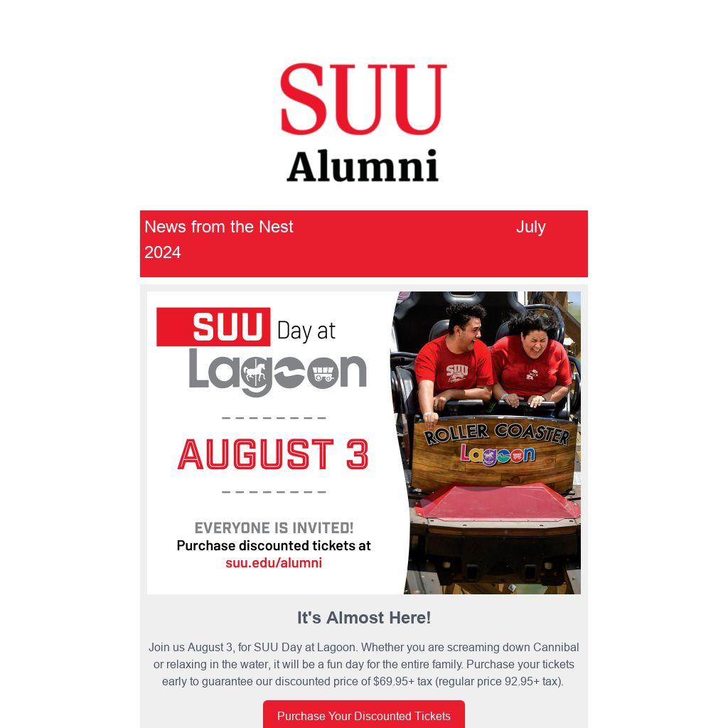 Join us August 3, for SUU Day at Lagoon. Whether you are screaming down Cannibal or relaxing in the water, it will be a fun day for the entire family. Purchase your tickets early to guarantee our discounted price of $69.95+ tax (regular price 92.95+ tax).