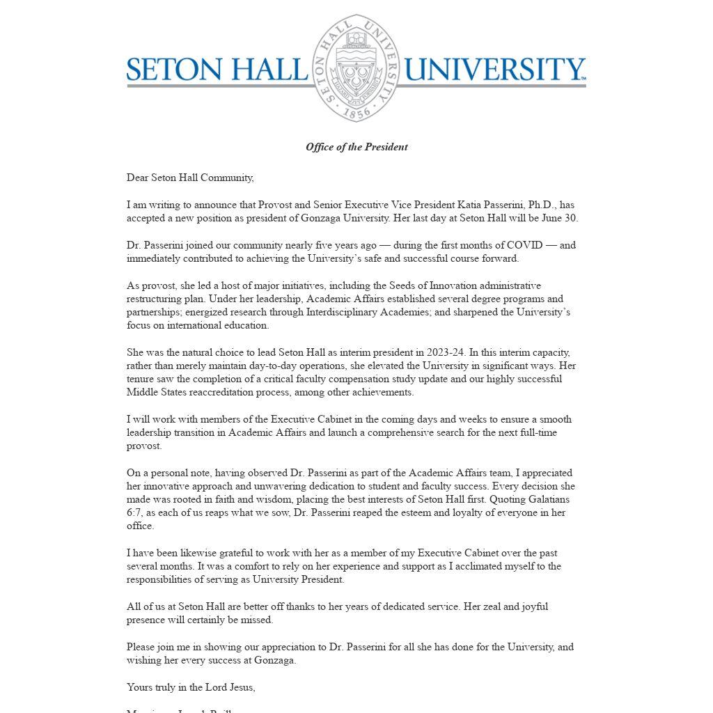 I am writing to announce that Provost and Senior Executive Vice President Katia Passerini, Ph.D., has accepted a new position as president of Gonzaga University. Her last day at Seton Hall will be June 30.