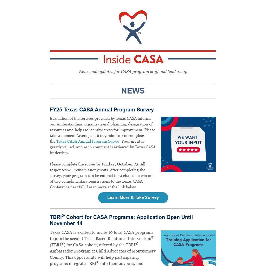 Please complete the survey by Friday, October 31. All responses will remain anonymous. After completing the survey, your program can be entered for a chance to win one of two complimentary registrations to the Texas CASA Conference next fall. Learn more at the link below.