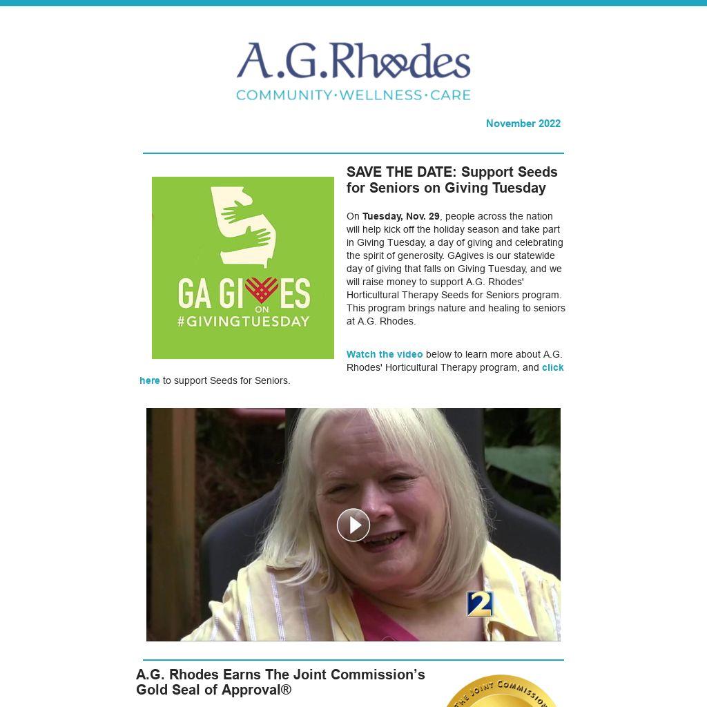 It's been another busy and fun month at A.G. Rhodes! We welcomed volunteers, enjoyed the gorgeous fall weather, celebrated birthdays, honored the veterans in our community, and showcased our very own local artists. Thank you to everyone who has helped us get the holiday season off to a great start!