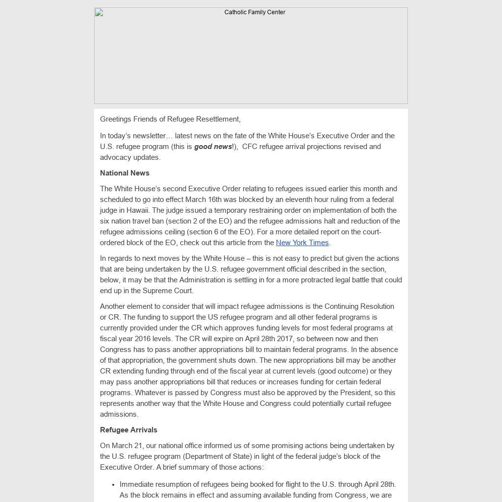 In today’s newsletter… latest news on the fate of the White House’s Executive Order and the U.S. refugee program (this is good news!), CFC refugee arrival projections revised and advocacy updates.