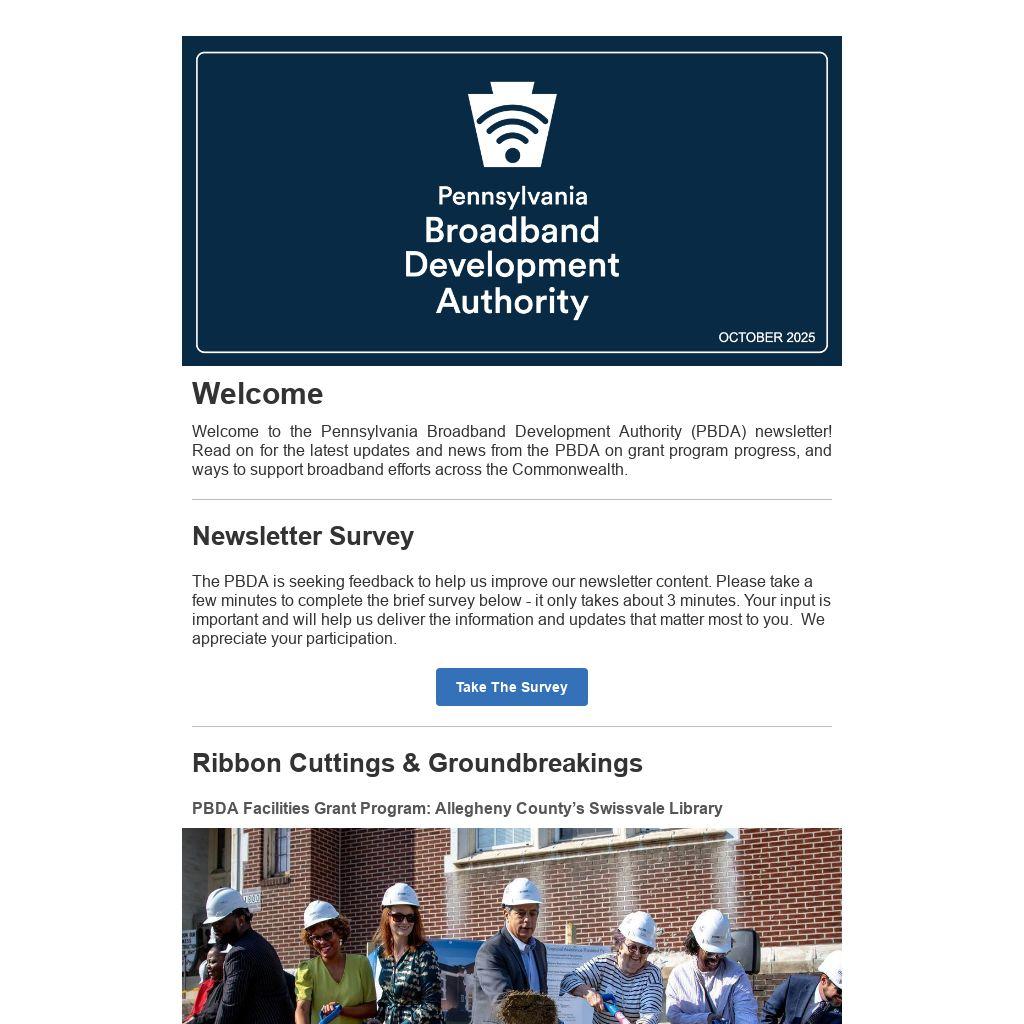 Welcome to the Pennsylvania Broadband Development Authority (PBDA) newsletter! Read on for the latest updates and news from the PBDA on grant program progress, and ways to support broadband efforts across the Commonwealth.Â