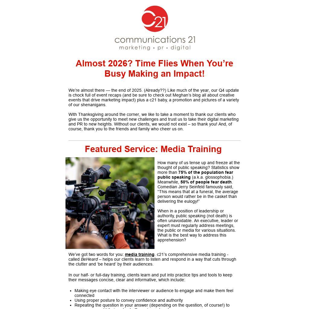 We’re almost there — the end of 2025. (Already??) Like much of the year, our Q4 update is chock full of event recaps (and be sure to check out Meghan’s blog all about creative events that drive marketing impact) plus a c21 baby, a promotion and pictures of a variety of our shenanigans.