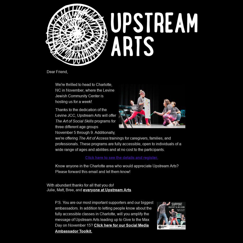 Know anyone in the Charlotte area who would appreciate Upstream Arts? Please forward this email and let them know!