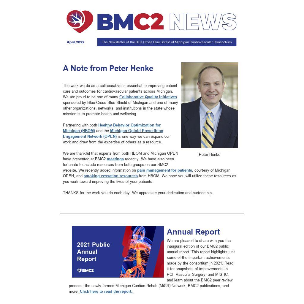 We are pleased to share with you the inaugural edition of our BMC2 public annual report. This report highlights just some of the important achievements made by the consortium in 2021. Read it for snapshots of improvements in PCI, Vascular Surgery, and MISHC, and learn about the BMC2 peer review process, the newly formed Michigan Cardiac Rehab (MiCR) Network, BMC2 publications, and more. Click here to read the report.