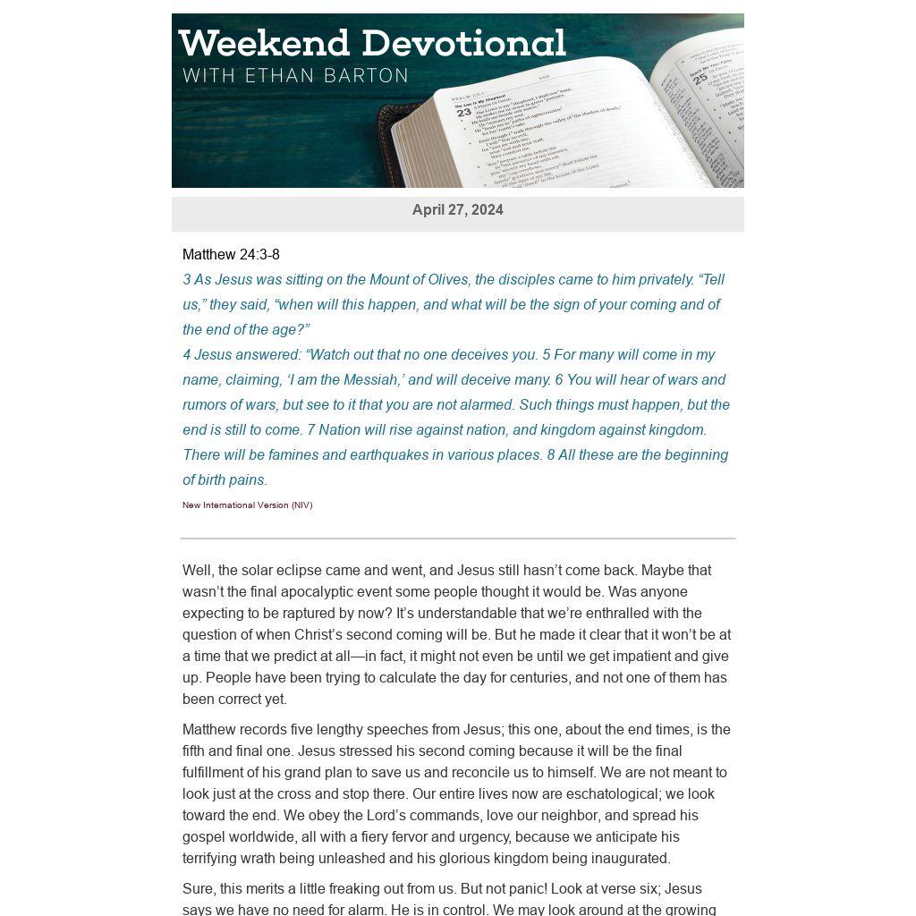 Well, the solar eclipse came and went, and Jesus still hasn’t come back. Maybe that wasn’t the final apocalyptic event some people thought it would be. Was anyone expecting to be raptured by now? It’s understandable that we’re enthralled with the question of when Christ’s second coming will be. But he made it clear that it won’t be at a time that we predict at all—in fact, it might not even be until we get impatient and give up. People have been trying to calculate the day for centuries, and not one of them has been correct yet.