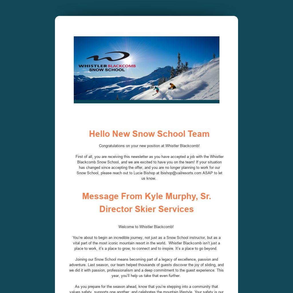 First of all, you are receiving this newsletter as you have accepted a job with the Whistler Blackcomb Snow School, and we are excited to have you on the team! If your situation has changed since accepting the offer, and you are no longer planning to work for our Snow School, please reach out to Lucie Bishop at lbishop@vailresorts.com ASAP to let us know.