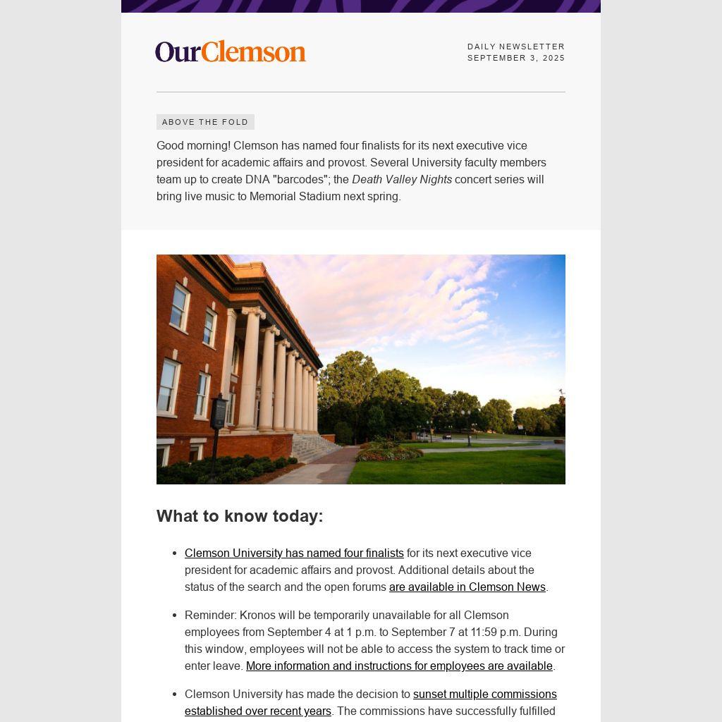 Good morning! Clemson has named four finalists for its next executive vice president for academic affairs and provost. Several University faculty members team up to create DNA "barcodes"; the Death Valley Nights concert series will bring live music to Memorial Stadium next spring.