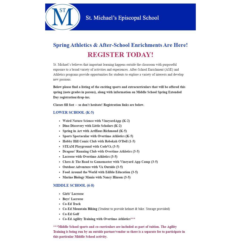 Extended Day is CLOSED on the following spring holidays: Mar 6-10, Apr 7&10, May 8 & 29