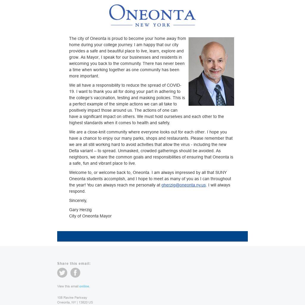 The city of Oneonta is proud to become your home away from home during your college journey. I am happy that our city provides a safe and beautiful place to live, learn, explore and grow. As Mayor, I speak for our businesses and residents in welcoming you back to the community. There has never been a time when working together as one community has been more important.