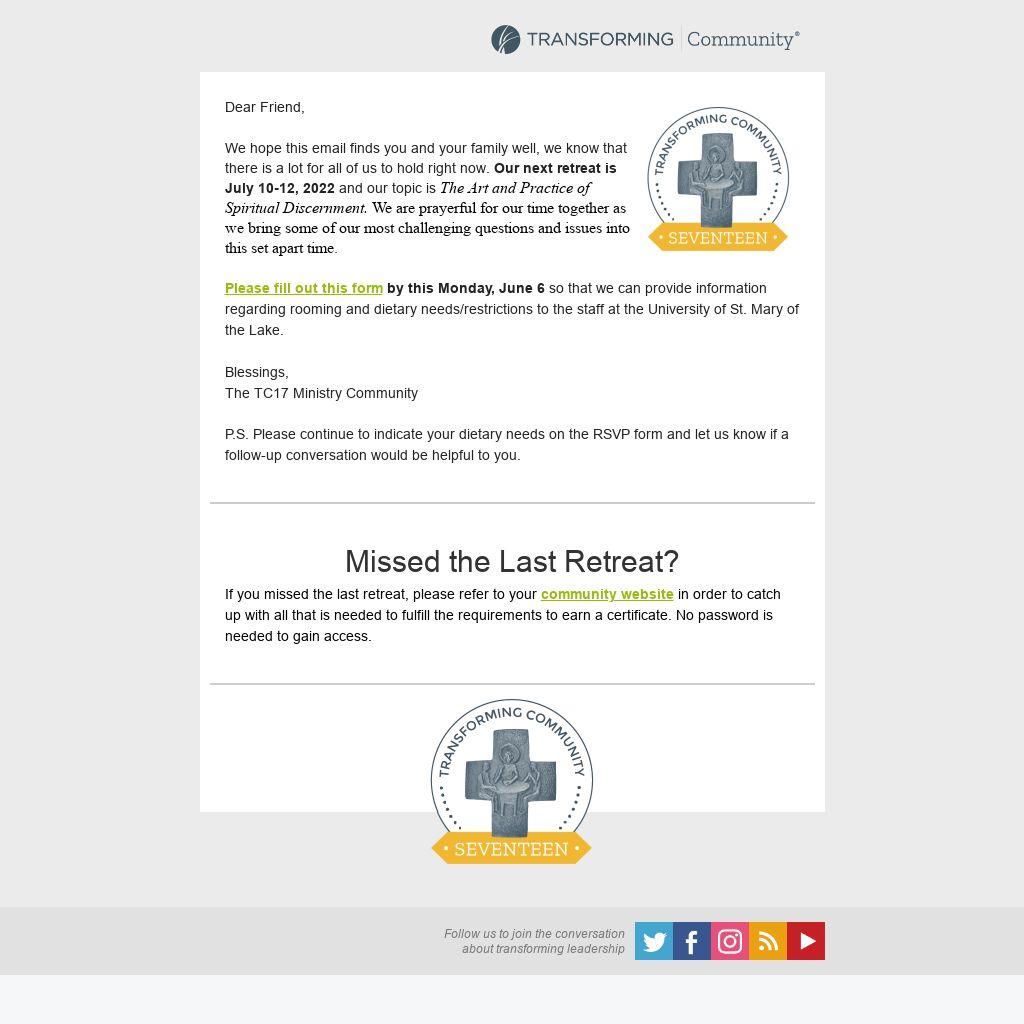 P.S. Please continue to indicate your dietary needs on the RSVP form and let us know if a follow-up conversation would be helpful to you.